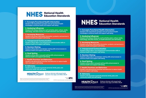 The National Health Education Standards (NHES) set performance indicators around the functional knowledge and essential skills required for adopting and maintaining healthy behaviors. States and local school districts across the country use the NHES to develop or revise existing standards, frameworks and curricula. HealthSmart proudly meets these standards and offers free resources to advertise in the classroom for educators. Download NHES posters and cards.